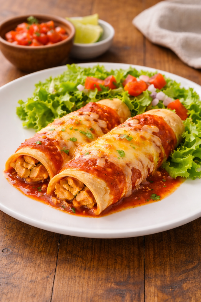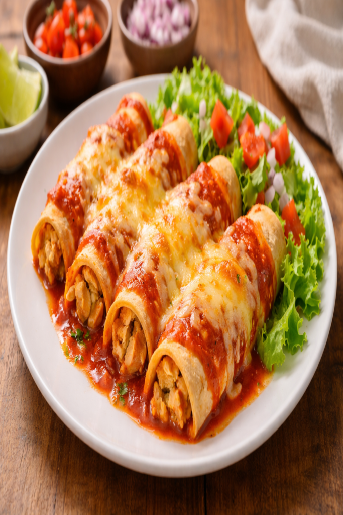Chicken enchiladas are soft tortillas filled with cooked chicken, covered with sauce and cheese, then baked. They are warm, cheesy, and full of flavor. This dish is easy to make and perfect for family meals.