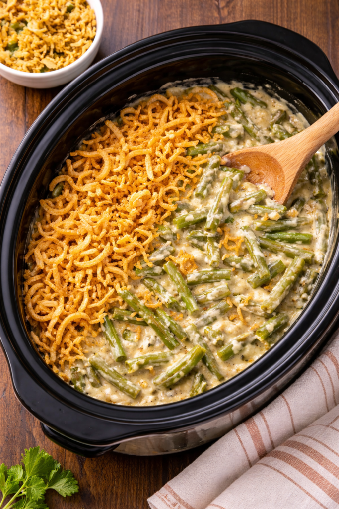 Crock Pot Green Bean Casserole is especially popular during holiday gatherings because it stays warm without drying out. Garnishing with fresh parsley or thyme adds colour and a touch of freshness before serving.