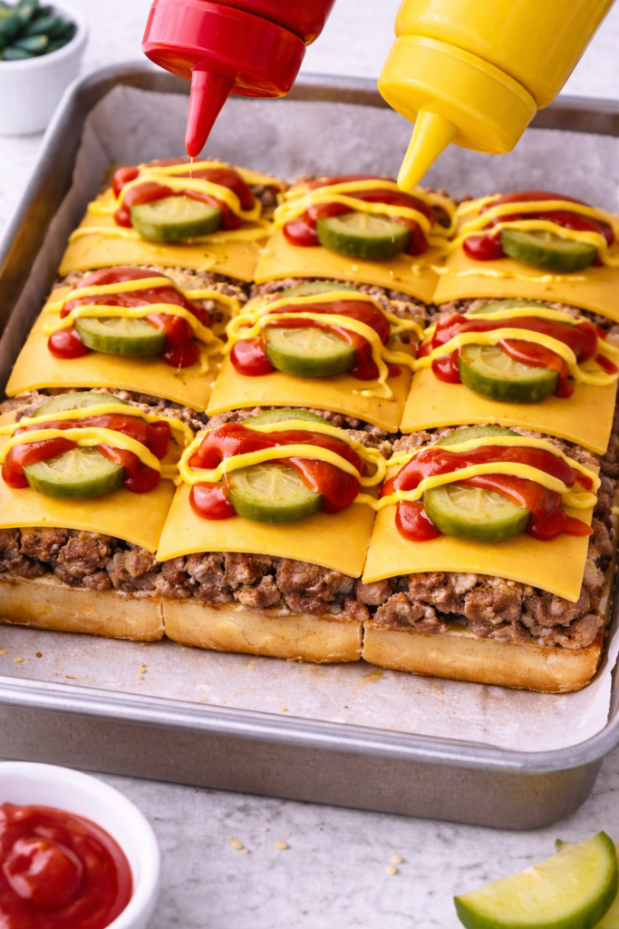 Lay cheese slices evenly over the beef while it’s still warm. Add pickle slices, then lightly drizzle ketchup and mustard for that classic cheeseburger taste.